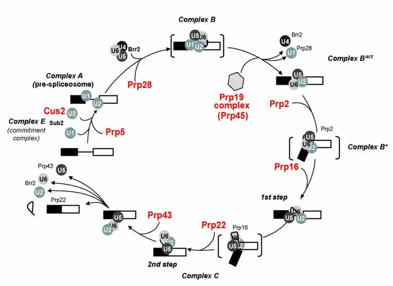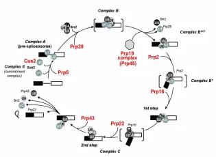 An overview of the lab's research activities. We are studying pre-messenger RNA (pre-mRNA) splicing in the budding yeast Saccharomyces cerevisiae. Pre-mRNA splicing takes place in a very large RNA-protein complex, the spliceosome, within which there are subparticles, including the small ribonucleoprotein particles (snRNPs: U1, U2, U4, U5 and U6), each composed of a small nuclear RNA (snRNA) and a set of proteins. The spliceosome is a highly dynamic molecular machine. During spliceosome assembly and during the course of the splicing reactions many dynamic RNA-RNA and RNA-protein conformational changes occur that are regulated by proteins. Proteins also regulate the specificity, accuracy and efficiency of the splicing process. We have investigated the functions of a number of key splicing factors, characterising their molecular interactions in the spliceosome. In addition, we are using more quantitative systems biology approaches to study the flow of RNA through the various RNA processing pathways. This allowed the development of stochastic models for splicing and transcription. Recently, we optimised a metabolic labelling protocol that allows monitoring the splicing and turnover of nascent transcripts with high kinetic resolution. Currently, we are investigating functional links between different RNA metabolic pathways. In particular, we have identified a novel link between transcription and splicing, and we proposed the existence of splicing-dependent transcriptional checkpoints. More recently, we have been studying links between splicing and chromatin, using the auxin inducible degron system to knock-down splicing factors and investigate the effect on histone methylation. We use biochemical, cell biological and genetic approaches, including in vitro splicing assays, yeast two-hybrid screens, quantitative real-time RT-PCR, chromatin immunoprecipitation (ChIP), ChIP-seq and RNA-seq. A functional link between transcription and splicingIn eukaryotic cells there is evidence for functional coupling between transcription and processing of pre-mRNAs. An important goal in our lab is to identify factors involved in coupling transcription and splicing and to elucidate the mechanism of coupling and its potential role in promoting efficiency and fidelity in gene expression. To better understand this coupling we performed a high-resolution kinetic analysis of transcription and splicing in budding yeast. This revealed that shortly after induction of transcription, RNA polymerase accumulates transiently around the 3’ end of the intron on two reporter genes. This apparent transcriptional pause coincides with splicing factor recruitment to the gene and with the first detection of spliced mRNA, and is repeated periodically thereafter. Pausing requires productive splicing, as it is lost upon mutation of the intron and restored by suppressing the splicing defect in trans. The carboxy-terminal domain of the paused polymerase large subunit is hyper-phosphorylated on serine 5, and phosphorylation of serine 2 is first detected here. Phosphorylated polymerase also accumulates around the 3’ splice sites of constitutively expressed, endogenous yeast genes. We propose the existence of splicing-dependent transcriptional checkpoints (Figure 1) that are associated with Pol II pausing. (Figure 1; Alexander et al., Mol Cell, 2010). Fig.1 RNA polymerase II (POL II) pauses near the 3' ends of introns while splicing occurs. We propose that this may be associated with a splicing-dependent transcriptional checkpoint. Completion of splicing signals satisfaction of the checkpoint. The amber and green Ps represent phosphorylation of serine 5 and serine 2 respectively in the carboxy-terminal domain (CTD) of the Pol II large subunit (Alexander et al., 2010). Transcriptional pausing may allow more time for quality control to be carried out. If quality is unsatisfactory, the checkpoint is not satisfied and the RNA is degraded, thereby avoiding production of defective proteins. We discovered that certain defects in specific splicing factors can give rise to transcription defects, with Pol II accumulating over introns. The accumulated Pol II is hyper-phosphorylated on serine 5 (pSer5) of the CTD, a characteristic of paused or stalled transcription (Chathoth et al., 2014). The concept of splicing-dependent transcriptional checkpoints is novel, although it resembles the transcriptional checkpoint for capping mRNAs, in which Pol II with pSer5 pauses while the capping enzymes modify the 5’ end of the nascent RNA. We speculate that similar checkpoints might be associated with the acceptance/rejection of alternative splice sites in higher eukaryotes. This is compatible with evidence that the rate of transcription can affect alternative splice site usage.Eight RNA-stimulated ATPases are involved in splicing. At least six of these (Prp2p, Prp5p, Prp16p, Prp22p, Prp28p, Prp43p; Figure 2) have quality control functions. They both promote conformational changes and monitor the accuracy of molecular interactions at different stages of the splicing process. We propose that transcriptional checkpoints are associated with the quality control activities of these ATPases. A Cus2p dependent checkpoint links pre-spliceosome formation with transcriptionThe Prp5p ATPase controls interaction of U2 snRNA with the intron’s branchpoint sequence as the pre-spliceosome forms (Figure 3). Our checkpoint hypothesis is supported by the finding that a temperature-sensitive prp5-1 mutation, that blocks pre-spliceosome formation, causes a transcription defect at 37oC, with pSer5 Pol II accumulating on introns. The U2-associated Cus2p, which should be displaced from the U2 snRNP by the ATPase activity of Prp5p, remains in a defective splicing complex. Significantly, deletion of CUS2 suppresses the transcription defect but not the splicing defect caused by prp5-1. Therefore, the transcription defect is not simply a direct consequence of a splicing defect but is