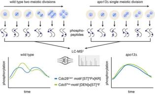 Feb 2024 Marston Lab - EMBO Authors Koch, L.B., Spanos, C., Kelly, V., Ly, T., and Marston, A.L Summary by Jenna Hare, Bird LabMeiosis is the process that produces the sex cells needed for successful reproduction. It involves two sequential cycles of division, where in each cell cycle the cell is divided into two cells. The processes of meiosis and mitosis differ, but little is known about how cells are programmed to undergo the extra cycle in meiosis. Therefore, the Marston Lab have researched the molecular dynamics of this process further. Their research uses budding yeast, a great model for studying the cell cycle as in this species, cell division can be easily manipulated to investigate the role of various proteins within it.The stages of the cell cycle are tightly controlled by a group of proteins called cyclin-dependent kinases (Cdks). These proteins add phosphate groups onto other working proteins, in a reversible process called phosphorylation. Phosphorylation changes the activity levels of proteins during the cycle, ensuring it is followed in the correct order. The Marston lab investigated these phosphoproteomic changes in more detail. They focused on a master regulator protein of meiosis called Spo13. Using proteomic techniques and specialised proteomic analysis, they showed how Spo13 directs the action of two key cell cycle proteins, named Cdc5Polo and Cdc28Cdk1, to phosphorylate other proteins during different stages of meiosis. Further analysis even found the specific regions of the proteins that are phosphorylated by the instructions of Spo13.This work has inspired a myriad of hypotheses into the details of these phosphorylation mechanisms and allows for further research in this field. Understanding the molecular mechanisms of meiosis will help to understand and find treatments for fertility issues and developmental disorders in humans in the future. Quantitative proteomics was carried out on samples of budding yeast undergoing the meiotic divisions synchronously. The dynamics of thousands of proteins and phospho-sites were quantified and motif analysis revealed two rounds of Cdc28Cdk1 and Cdc5Polo kinase motif phosphorylation. In the absence of the meiosis-specific protein Spo13, only a single division occurs and the bi-modal pattern of Cdc28Cdk1 and Cdc5Polo kinase motif phosphorylation is disrupted in a subset of sites. Related Links Journal URL Marston Lab Website DOI This article was published on 2025-01-22