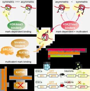 February 2025, Voigt Lab, Molecular Cell Authors Bryan, E., Valsakumar, D., Idigo, N.J., Warburton, M., Webb, K.M., McLaughlin, K.A., Spanos, C., Lenci, S., Major, V., Ambrosi, C., Andrews, S., Baubec, T., Rappsilber, J., and Voigt, P. Summary By Elena Hein, Bird LabHistone modifications regulate transcription by modulating DNA accessibility and recruiting activating or repressive chromatin factors. Nucleosomes may be marked symmetrically (monovalent), or asymmetrically (bivalent), thus controlling differential recruitment of histone mark readers. Promoters of developmental genes in embryonic stem cells (ESCs) are marked by bivalent nucleosomes, carrying both activating H3K4me3 and repressive H3K27me3, which is thought to maintain genes in a repressed yet activation-ready “poised” state. While the establishment of bivalency is fairly well understood, the exact mechanisms by which these domains keep genes in a poised state are still unclear.In a recent paper published in Molecular Cell, Bryan et al. (2025) investigated how asymmetric bivalent nucleosomes influence reader recruitment. Using label-free quantitative mass spectrometry (LFQ-MS) -based nucleosome pull-down assays with mouse nuclear extracts, as well as recombinant symmetric and asymmetric nucleosomes, they found that bivalent nucleosomes preferentially recruited H3K27me3-binding repressive complexes while inefficiently recruiting H3K4me3-binding activators. Both activating and repressive readers were recruited less efficiently to bivalent nucleosomes than to their symmetric monovalent counterparts, but the researchers suggest that additional H3K27me3-independent nucleosome-binding properties of repressive complexes enhance their binding to asymmetric nucleosomes compared to activators, thus promoting a repressed state. The study also identified the acetyltransferase complex KAT6B as one of several bivalency-specific interactors. Functional assays revealed that KAT6B, and its less abundant paralogue KAT6A, are required for neuronal differentiation of mouse embryonic stem cells, acting to preserve the poised state of developmental genes.These findings suggest that asymmetric bivalent histone modification patterns bias recruitment toward repression, influenced by additional H3K37me2-independent nucleosome binding affinities of repressive chromatin complexes. Identification of bivalency-specific readers such as KAT6B highlights additional layers of histone-based gene regulation and underscores the importance of reader-recruitment dynamics in controlling developmental gene expression programs. Symmetric modification of nucleosomes boosts recruitment of histone mark reader proteins through so-called allovalent effects. In the case of repressive Polycomb complexes, multivalent interactions with other nucleosome features allows efficient recruitment also at asymmetric, bivalent nucleosomes. Multivalent interactions with bivalent nucleosomes further allow for recruitment of other factors such as KAT6B. Loss of KAT6B prevents activation of bivalent genes during neuronal differentiation. Related Links Journal URL PI Website DOI This article was published on 2025-08-27