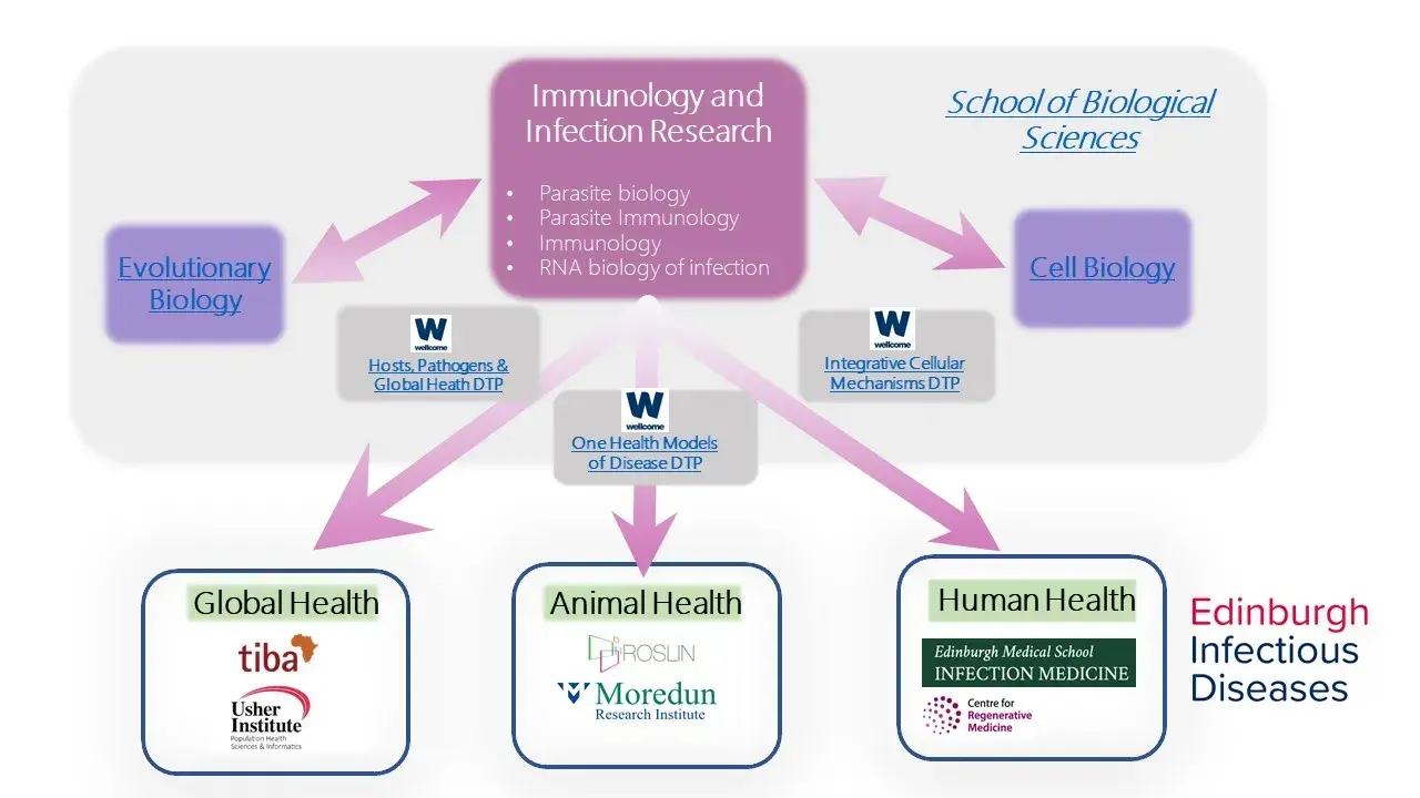More information on research topics, postgraduate research opportunities, and translational activities. Overview Research in the Institute for Immunology and Infection Research encompasses immunology, parasite biology, parasite immunology and the RNA biology of infection. We share extensive links and research collaborations with our sister Institutes of Evolutionary biology and Cell Biology within the School of Biological Sciences. Our focus is on human, animal and global health and our researchers are fully integrated within the University-wide Edinburgh Infectious Diseases network. The excellence of our research culture is recognised through our Wellcome Trust PhD programme ‘Hosts, Pathogens and Global Health’, which closely links with the allied Wellcome PhD programmes, ‘One Health Models of Disease’ (hosted within the Roslin Institute) and “Integrative Cellular mechanisms” (hosted within the Wellcome Centre for Cell Biology). Our Global Health activity is underpinned by the NIHR TIBA (Tackling Infections for the Benefit of Africa) Unit. Immunology and Infection PI's form a major part of the Centre for Immunity, Infection and Evolution. The Centre carries out cross-disciplinary research across the broad scope of infectious disease, addressing the major challenges in global health today.Visit the Centre for Immunity, Infection and Evolution website Research topics The research of principal investigators in Immunology and Infection encompasses four overlapping topics of study: Postgraduate research opportunities We offer several postgraduate degrees covering a wide range of research interests. Translational activities Overview of Translational work in Immunology and Infection. This article was published on 2024-06-17