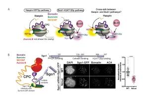 Structural biology of cell division. Accurate distribution of chromosomes to the daughter cells during cell division requires selective stabilisation of chromosome-microtubule attachments, capable of supporting chromosome bi-orientation (where sister chromatids are attached to microtubules emanating from opposite spindle poles) and maintaining sister-chromatid cohesion until all sister-chromatids achieve bipolar attachment. Two chromosomal sites work at the heart of these processes: the centromere, defined by the enrichment of CENP-A (a Histone H3 variant) nucleosomes, and the inner centromere, which lies between the two sister-chromatids. The centromere acts as an assembly site for the kinetochore, where microtubules attach. Unlike canonical chromatin, CENP-A nucleosome undergo DNA replication-mediated dilution due to the distribution of existing CENP-A to the newly made DNA strand during each round of the cell cycle. To preserve centromere identity and hence to maintain the microtubule attachment site at the right place, CENP-A levels must be replenished during each cell cycle round. The inner centromere acts as a signalling/regulatory hub, recruiting factors that regulate kinetochore-microtubule attachments and control timely sister-chromatid separation. We have a good understanding of the mechanisms controlling the assembly and function of the kinetochore. However, structural and molecular bases for the mechanisms underlying the maintenance of centromere identity and the establishment of the centromere-associated regulatory interaction network are just emerging. The overarching goal of our current work is to obtain high-resolution, mechanistic understanding of centromere/inner centromere assembly and their function in ensuring accurate segregation of chromosomes during cell division. This is crucial as defective chromosome segregation often results in aneuploidy, a chromosomal numerical aberration implicated in miscarriages, infertility, birth defects and several human cancers. Exploiting our experience in integrating structure-function approaches (X-ray crystallography, cryo electron microscopy, Crosslinking/Mass Spectrometry, biochemical/biophysical methods with human cell-line based functional assays) to study chromosome segregation, we currently aim to address three important questions:1. How is the inner centromere signalling/regulatory platform established?2. How does the inner centromere recruit enzymatic activities to ensure accurate chromosome segregation?3. How is the centromere identity preserved through generations of cell division?Recently, we discovered that the Chromosomal Passenger Complex (CPC), which is a major centromere associated regulator of chromosome segregation has an intrinsic nucleosome binding activity essential for its chromosome association and function (Abad et al., 2019, J Cell Biol). We have also characterised the molecular basis for how CPC interacts with Sgo1, a key regulator of sister-chromatid cohesion (Abad et al., 2021, bioRXiv).Our ongoing and future work will provide unprecedented details of centromere-mediated control of chromosome segregation and allow us to build a comprehensive mechanistic model for error-free chromosome segregation, a process that has been fascinating researchers for more than a century. A. Overview of proposed pathways responsible for the centromere localization of the Chromosomal Passenger Complex (CPC; Borealin, Survivin, INCENP and Aurora B), a master regulator of chromosome segregation. Two histone phosphorylations, Histone H3 Thr3 (H3T3p) and Histone H2A Thr120 (H2AT20p), mediated by Haspin and Bub1 kinases respectively, recruit CPC to the inner centromere. CPC binds H3T3p directly via Survivin and H2AT120p indirectly via Sgo1.B. Molecular basis for CPC-Sgo1 interaction: CPC-Sgo1 binding requires physical recognition of Histone H3 like N-terminal tail of Sgo1 by Survivin. Disrupting this interaction perturbs CPC centromere association and leads to chromosome missegregation. JP Lab, Gene Centre Munich This article was published on 2024-06-17