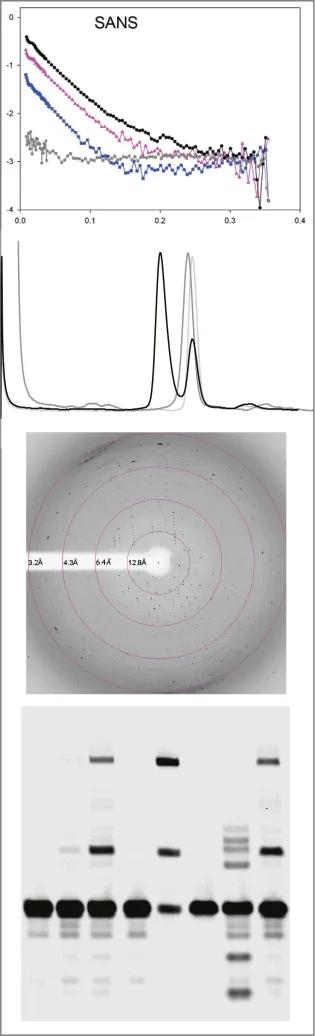 A 4 panel image showing solution scattering data, a chromatogram, a X-ray diffraction pattern and a DNA integration assay.