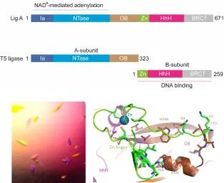 DNA ligase enzymes play a key role in DNA replication, repair and recombination by joining strands of DNA whenever new DNA is being made or when damaged DNA is being repaired. They catalyse phosphodiester bond formation by a three-step reaction mechanism that characteristically uses either NAD+ or ATP as the energy source. Recently we have identified a group of bacteriophages, the T5-like phages, that encode a novel split DNA ligase, which is (unusually) composed of two sub-units. These form a dimer with NAD+-dependent DNA ligase activity. We propose that there is a connection between the split DNA ligase and a second highly distinctive feature of the T5-like phage: the presence of single-stranded nicks in the linear dsDNA packaged genomes.