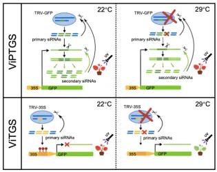 Temperature modulates virus-induced transcriptional gene silencing via secondary small RNAs Yue Fei, Douglas E. Pyott, Attila Molnar Link: https://nph.onlinelibrary.wiley.com/doi/10.1111/nph.17586Different molecular mechanisms of virus induced posttranscriptional gene silencing (ViPTGS) and virus induced transcriptional gene silencing (ViTGS). At 22°C, in ViPTGS, primary siRNAs derived from tobacco rattle viruses (TRV)-GFP mediate GFP mRNA cleavage resulting posttranscriptional gene silencing (PTGS) of GFP. The cleavage of GFP mRNA can further trigger the amplification of secondary siRNAs from the plant-derived GFP transcript. The production of secondary siRNAs enhances PTGS of GFP in Nicotiana benthamiana 16c plants. In ViTGS, primary siRNAs derived from TRV-35S direct DNA methylation at the target 35S promoter sequence resulting transcriptional gene silencing (TGS) of GFP. ViTGS does not trigger secondary siRNAs amplification, but mainly depends on virus-derived primary siRNAs. At the higher temperature of 29°C, plants exhibit effective antiviral RNA silencing responses to clear viral RNAs. This limits the production of virus-derived primary siRNAs. Unlike ViPTGS, ViTGS is not able to produce a large number of secondary siRNAs and only depends on its primary siRNAs resulting the loss of silencing phenotype at later times of the infection process. Solid and dotted arrows indicate full and reduced flux, respectively Publication date 29 Jun, 2021