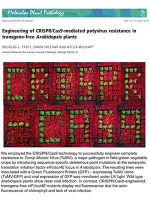 Current research projects at Molnar Lab. Genome editing tools and strategies for functional genomics Genome editing nucleases are currently revolutionizing both molecular biology and industrial biotechnology. The latest additions to these nucleases are the RNA-programmable CRISPR/Cas enzymes. CRISPR endonucleases induce targeted double-stranded DNA breaks, triggering cellular DNA repair pathways. Of these pathways, non-homologous end-joining (NHEJ) results in random insertions and deletions at the target site, whereas HR allows homology-directed, precise editing by using DNA repair templates. Our mission is to develop novel CRISPR/Cas-based genome editing tools and strategies for functional genomics and industrial biotechnology, both in plants and algae by understanding and harnessing the underlying DNA repair pathways. Engineering of CRISPR/Cas9-mediated potyvirus resistance in transgene-free Arabidopsis plants Efficient targeted DNA editing and replacement in Chlamydomonas reinhardtii using Cpf1 ribonucleoproteins and single-stranded DNA Synthesis and action of RNA silencing-associated small RNAs Small non-coding RNA (sRNAs) molecules are key components in many biological processes, including development, stress-response and disease control against molecular parasites such as viruses and transposons. They mediate post-transcriptional gene silencing that involves mRNA cleavage/destabilization or translational inhibition as well as RNA-dependent DNA methylation and histone modifications that can lead to transcriptional gene silencing. We study the synthesis and action of sRNAs with particular emphasis on epigenetic modifications driven by sRNA molecules using a combination of biological systems including plants and viruses and the latest high throughput sequencing technologies. Potential for gene editing in antiviral resistance Non-perfectly matching small RNAs can induce stable and heritable epigenetic modifications... This article was published on 2025-05-23