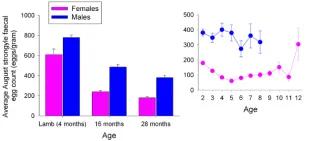 Work by Ken Wilson and colleagues also demonstrated marked differences between the sexes in FECs across the lifespan. The first eggs are detectable in the faeces of lambs at around 45 days old and the subsequent increase in FECs is much more dramatic in male than in female lambs. Outside of the peri-parturient period, males continue to have higher worm burdens than females – and the reasons for this difference remain an important topic for current and future research. This research also showed that as males age, their egg counts decline until around two years of age and in females FECs also decline until around 4 or 5 years of age. These declines probably reflect the acquisition of immunity. Recent work led by Adam Hayward showed that FECs then start to increase as animals age, possibly as a result of the deterioration of immune function in later life. In females, this rate of increase in worm burdens with age is exacerbated when individuals experienced harsh over-winter conditions earlier in their lifetimes. Furthermore, old females give birth to lambs that themselves exhibit higher egg counts than do lambs from females in their prime, suggesting parasitological effects of ageing may span generations.