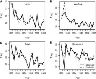 Summary of our research on population ecology of Soay sheep. The Soay sheep population is unusual in that it fluctuates dramatically in size with time (see history and figure, right). In some years the population can shrink by up to 70% as deaths massively outnumber births. A key objective of our research on the population dynamics of the Soay sheep has been to understand why we see such fluctuations in population size.The broad approach we have taken is to start identifying the key processes that we suspect generate the fluctuations in population size. Having done this, we then derive models that incorporate these processes. Next, we parameterize these models using the field data we collect. We then compare predictions from the models with what we observe in the field. We also use mathematical and computational tools to analyze our models and allow us to understand why they make the predictions they do. Our first model was remarkably simple. Grenfell et al. 1992 derived a model that only incorporated density-dependence. This model proposed that sheep compete with one another for food. When their numbers are low, birth rates are high and the population rapidly grows, quickly overshooting carrying capacity – a number describing the maximum number of sheep the island can support during winter. Insufficient food to go round means many sheep die and the population crashes. Although Grenfell’s model did well in capturing the ups and downs in population size that we observed early in the study, it soon became clear that it was a rather crude approximation of reality. So our next step was to include weather as well as density-dependence. We found that for population crashes to occur we need both high density and bad weather (Grenfell et al. 1998). But the sheep surprised us. Although this second model was an improvement upon our first, it still didn’t particularly accurately describe the way the population fluctuated. Our next step was to write down a model that explicitly included birth and death rates that varied between both males and females and sheep of different ages. This model showed that these different groups of animals were influenced by weather and population density in contrasting ways. A consequence of this was we discovered that population density, weather and the age- and sex-structure of the population interacted to influence the population dynamics (Coulson et al. 2001). Still we weren’t satisfied with the performance of the model. One issue was with the way we had characterized the weather. We had found that using local weather was a challenge because there are so many different ways in which it can be measured. In contrast, large-scale weather indices, like the North Atlantic Oscillation, provided a convenient summary of local weather. However, it proved a rather crude predictor of conditions on St. Kilda. We refined our understanding of the role that local weather plays by modeling the consequences of the timing of individual storms on over-winter survival (Hallett et al. 2004). We found that the timing of specific storms had the potential to substantially impact the number of sheep that survived each winter. Figure (From Ozgul et al. 2009): change in the average body size (z bar) of female (a) lambs, (b) yearlings, (c) adults aged between two and six, and (d) senescent sheep aged seven and over. The solid lines show observed average weights in each age-class; the dashed lines show the mean weights we predicted. A second issue was that the sheep were getting smaller (see figure above), so we next needed to think about incorporating body weight into our models. First, we needed to statistically identify the extent to which the population dynamics were likely influenced by the size of sheep on the island (Pelletier et al. 2007). We found that in years when the weather was bad, the distribution of sheep body weights contributed substantially to whether the population increased or not, while in good years body weight contributed little. Armed with this insight we were now in a position to start modeling why the population size of sheep had been showing a tendency to (noisily) increase while the sheep had been getting smaller (Ozgul et al. 2009). The models we developed here suggested that climate change had altered the way sheep competed for food. A consequence of this was that growth rates of the average sheep were reduced, and more smaller sheep were surviving through the winter than used to be the case. The approach developed in Ozgul et al. 2009 led to us to appreciate that we could write down some very general theory from which we could not only track the dynamics of population size, but also of sheep life history and characters like body size and coat colour (Coulson et al. 2010). Our aim now is to use this approach to gain further understanding of why the sheep population fluctuates in the way it does. Of course, there were many statistical and theoretical challenges associated with constructing population models. We have spared the reader the gory details of the various challenges we met along the way. However, the interested reader can find the literature cited, and other papers that describe these challenges, and the solutions we found, on the publications page. This article was published on 2024-08-07