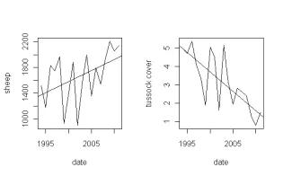 Outline of our research on vegetation on Hirta. We study the vegetation at two periods each year: in March, before the grass has started to grow, and when things are as hard for the sheep as they get; and in August when the food supply is as good as it ever gets. We measure the dry weight of all of the different plant species separately, so most of our research time is spent separating different blades of grass into neat miniature haystacks, prior to drying each sample in the oven, then weighing them. This work is carried out at 6 locations on each of 5 transects that run uphill from the shore, through the inbye grasslands, and into the heath above the Head Dyke (30 sampling locations in all). Sheep numbers have been consistently high for the last 9 years, and this is reflected in the vegetation. In 2011 we saw total biomass at its second-lowest ever in both March and August: 7.2 g per 0.04 m2 in March (long-term mean = 10.7; only March 2009 was lower at 6.8) and 9.3 g per 0.04 m2 in August (long-term mean = 15.6; only August 2008 was lower at 8.9). Despite the high sheep population in 2010, the population increased slightly to 2,141 in August 2011, preserving the pattern that we have never seen two population declines in a row since the study began in 1985. Figure 1. Glen Bay in March when there is precious little green grass left for the sheep to eat. The in-bye grassland on Hirta is the most productive plant community used by the Soay sheep. At a scale of 10cm or so, the sward consists of a mosaic of gaps and tussocks. The gaps are closely-grazed, remain bright green all year round, and typically contain lots of clover (Trifolium repens). The tussocks are much taller (up to 20cm sward height), more lightly grazed, and in winter are made up largely of dead organic matter (uneaten grass production left over from the previous summer). For both gaps and tussocks, there is a very strong seasonal cycle in their biomass and botanical composition. Green biomass is high in summer and low in winter, with dead organic matter showing the opposite pattern. Because they can grow at very low temperatures, bryophytes (mosses and liverworts) benefit from reduced light competition resulting from die-back of the grasses, and peak in abundance in winter. As is so often the case in studies of climate change, the size of these within-year fluctuations is large compared to the long-term trends in average plant biomass (Figure 2.) There is a significant downward trend over time in green biomass in tussocks (top right; p < 0.01) but not in gaps (top left). Figure 2. Time series for March and August (1993 to 2011) green biomass (dry mass of green grass plus herbs per 0.04m2; top row), dead organic matter (DOM mostly dead grass; centre row), and bryophytes (mosses plus liverworts; bottom row), in gaps (left column) and tussocks (right column) from the inbye grassland on Hirta (this is the Agrostis-Holcus grassland between the Head Dyke and the Shore; under the National Vegetation classification, it is U4 Festuca ovina – Agrostis capillaris – Galium saxatile grassland: Holcus lanatus – Trifolium repens sub-community). Note the differences in scale on the y-axes between rows and columns (e.g. there is much more green biomass and DOM in tussocks than in gaps, and more bryophyte biomass in gaps than in tussocks). Fluctuations in the sheep population are reflected by changes in the distribution, abundance and botanical composition of gaps and tussocks. In the year following a population crash, grazing pressure is relatively light, offtake is low, and tussocks are larger and more numerous. The result is that dead organic matter builds up to a peak in the winter following the crash. When sheep numbers are high (as they have been for the last 9 years), then tussocks are rare (especially in winter) and gaps are numerous and very closely grazed. Figure 1 shows the very clear log-term downward trend in tussock cover. It will be interesting to see if tussock cover ever returns to its pre-2005 levels. Figure. 3. The clearest consequence of increasing sheep numbers (left; whole island count in August showing more than 39 extra sheep per year on average; r2 = 0.48) has been a decline in the mean cover of tussocks in the following March (right; p < 0.001). Note that the slight increase in whole island count in August 2011 (top right of the sheep time series), preserved a pattern that we have never yet seen two years of population decline in a row. Tussock cover (scored on a scale of 1 to 5; right) is an average score out of 30 across 14 stratified random sampling stations within the Head Dyke each year. A score of 5 equates to tussock cover of 5/30 = 16.7%. Clearly this linear trend cannot continue (it predicts negative tussock cover by 2015), and we expect that tussock cover would increase in the year following a crash (if we ever see one again). The Soay sheep system on Hirta represents one of the longest-running detailed studies of a plant-herbivore interaction anywhere in the world. From a botanical perspective, the system is ideal because the Soay sheep are the only large herbivores on the island (there are no rabbits and no voles), so all grazing impacts can be attributed unequivocally to the sheep. Similarly, the Soay sheep have no predators, so their population is clearly food-limited, and hence must be regulated by competition for food. This article was published on 2024-08-07