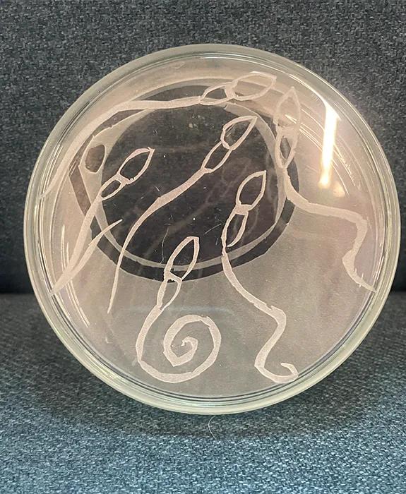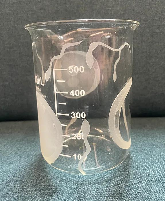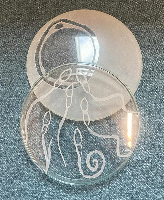 This section of artwork consists of glass (mostly lab equipment) sandblasted with patterns associated with reproductive biology. Beaker sandblasted with images of oocytes and sperm cells. Test tubes sandblasted with images of single helices – the shape of a single strand of DNA. Petri dish: one side sand-blasted with sperm and other with the oocyte. The two sides overlap depicting fertilisation. Petri dish: one side sand-blasted with sperm and other with the oocyte. The two sides are overlaid completely. Conical flask sandblasted to depict sperm cells. Round flask sandblasted with chromosome pairs and sperm cells. Culture media bottle decorated with sand-blasted images of oocytes, sperm and DNA double helix. A cocktail glass decorated with sand-blasted images of embryos at different stages of preimplantation development. Microscope slide sheets sandblasted with images of sperm cells. This article was published on 2024-08-22