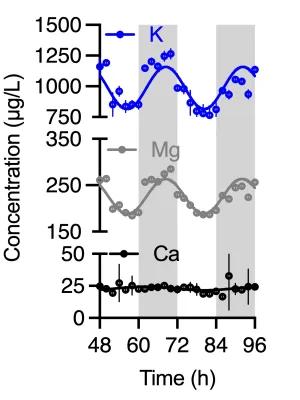 Our work established that circadian rhythms in the intracellular concentrations of potassium and magnesium are pervasive in human cell types, as well as in other eukaryotes. These ion rhythms functionally affect some of the most fundamental aspects of cell biology, including translation, cytoplasmic conductivity, and proteostasis. A large part of our research activity pursues hypotheses into key regulatory functions that ion rhythms might have in the circadian organisation of the cellular landscape. For example, we believe that intracellular potassium levels orchestrate circadian rhythmicity and cell division.